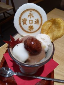 四条河原町にある「永楽屋」の芋栗パフェで。栗ぜんざいと迷いましたが、初めて食べるこちらにしました。