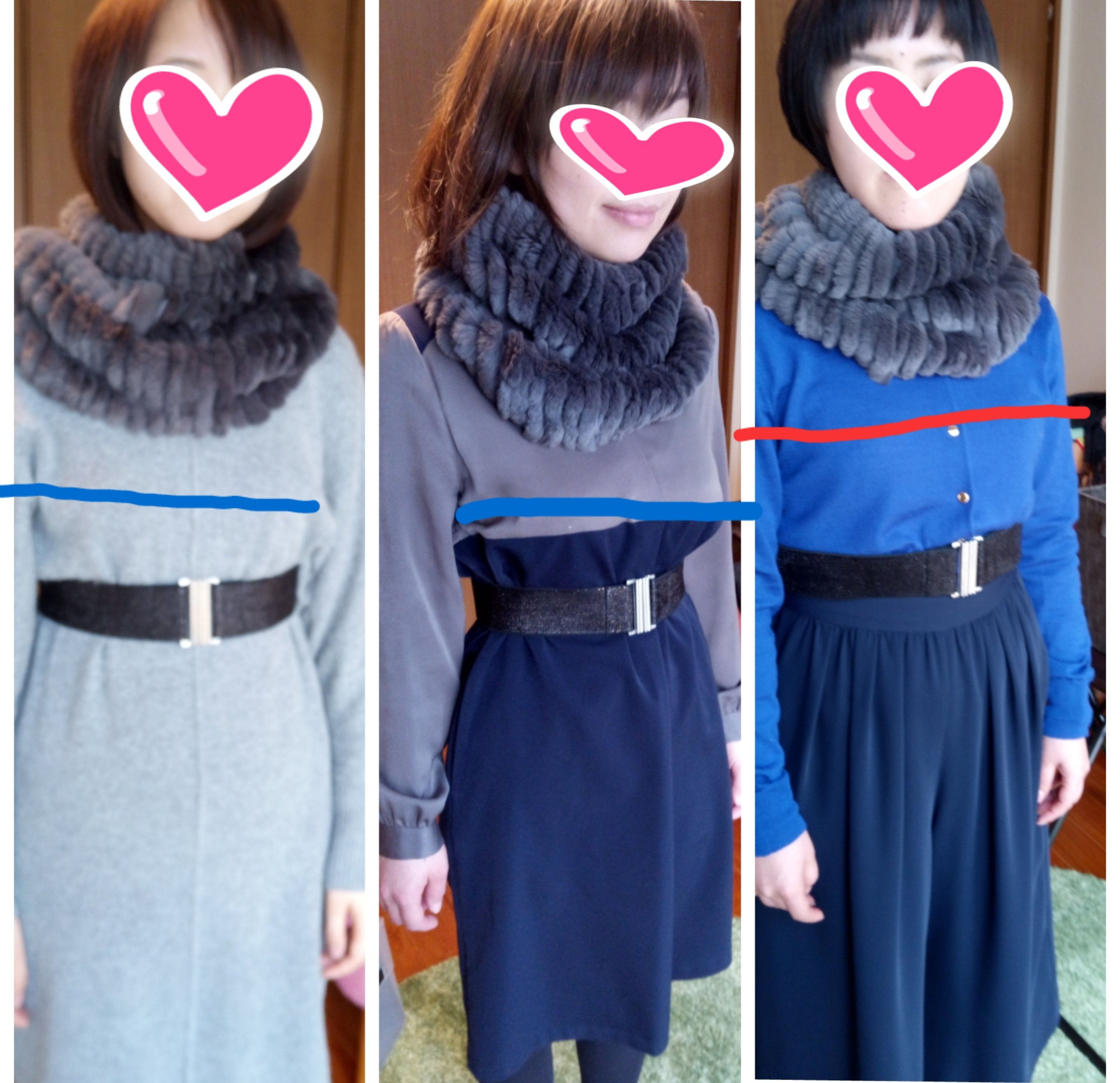 ストレートのお客様がスヌードのようひ胸元にボリュームのあるものを身につけるととても苦しそうにみえます。